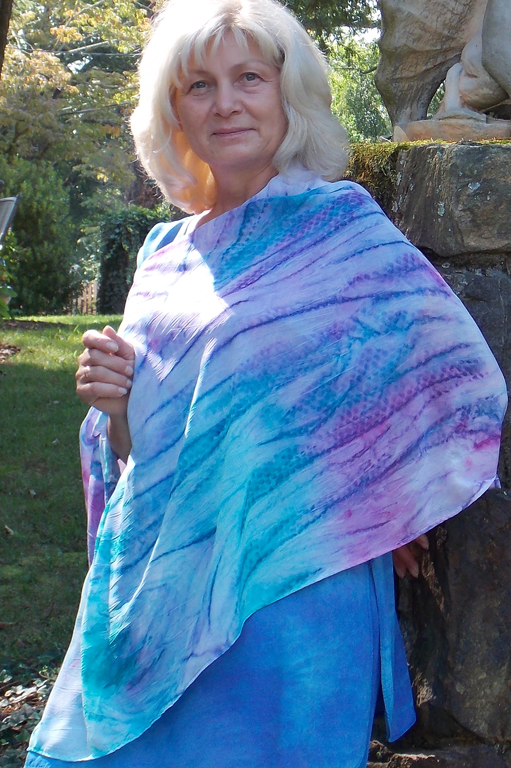 The patterns and colors are made by resist objects. Sunprinting is the process. The Poncho shrug is worn over this fun and fashionable rayon hand dyed tunic and matching pants. What a beautiful way to enjoy a day on the town visiting the art galleries or relaxing with friends.